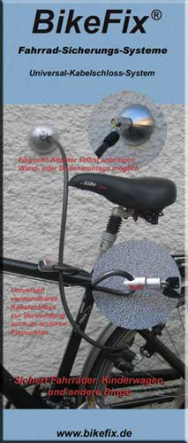 Mit dem BikeFix- Universal-Kabelschloss-System können Sie Ihren persönlichen Fixpunkt, dort wo es Ihnen erlaubt ist, durch einfache Anbringung des Wandadapters herstellen. Nun können Sie Ihr Fahrrad in bequemer Haltung ortsfest anschließen.